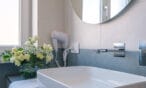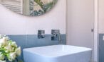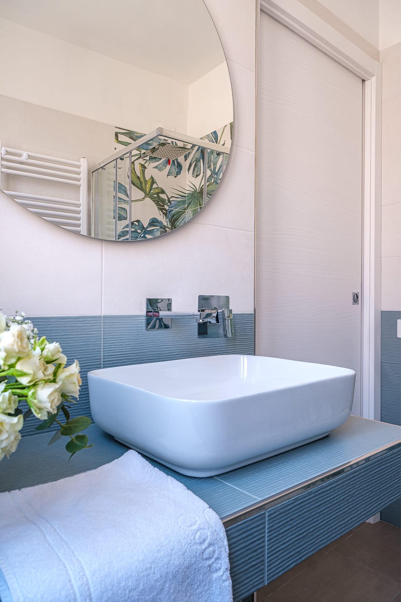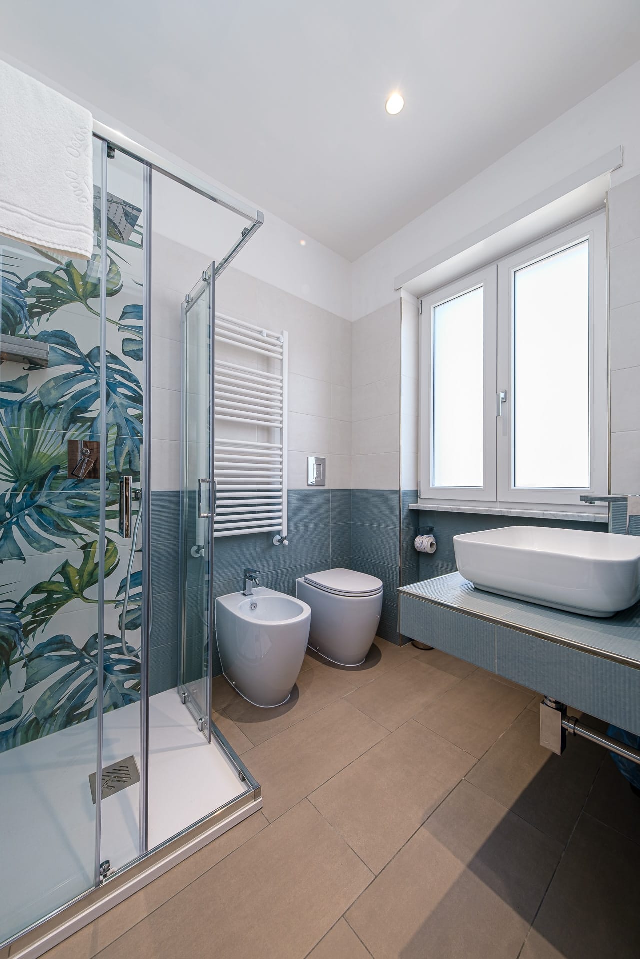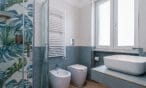 Il bagno, con la sua doccia decorata in stile jungle, regala energia fin dal mattino.