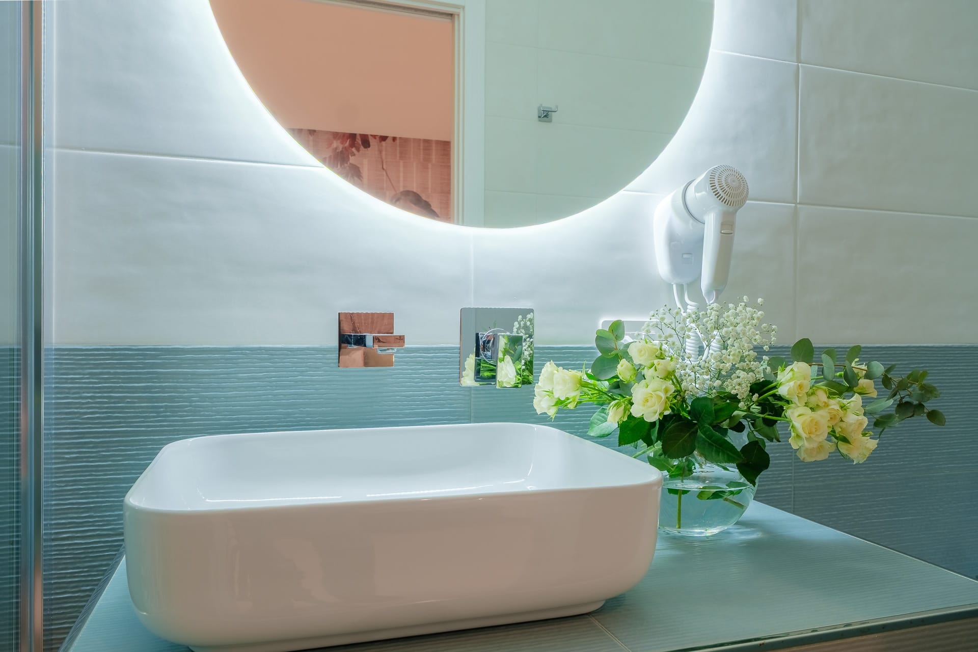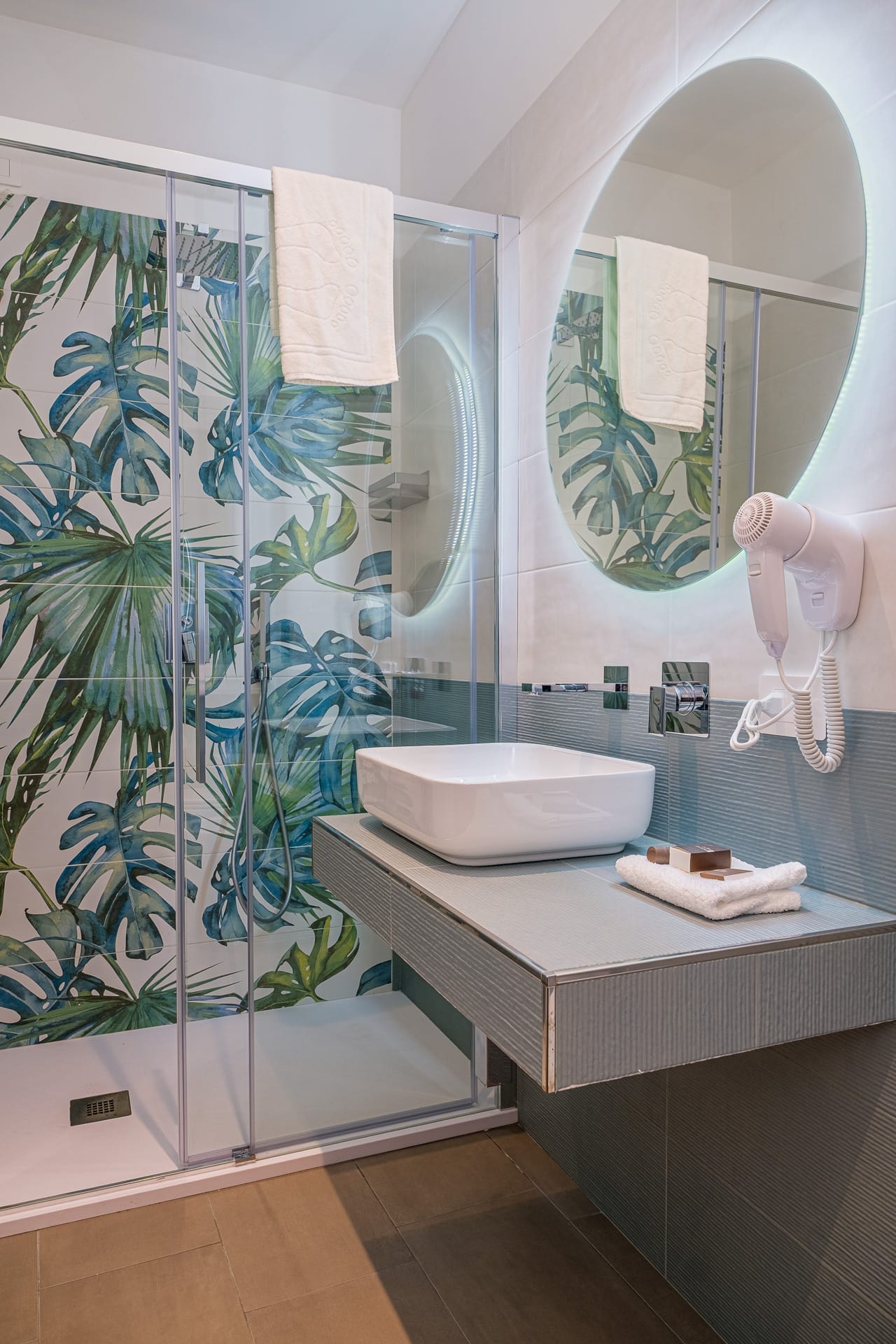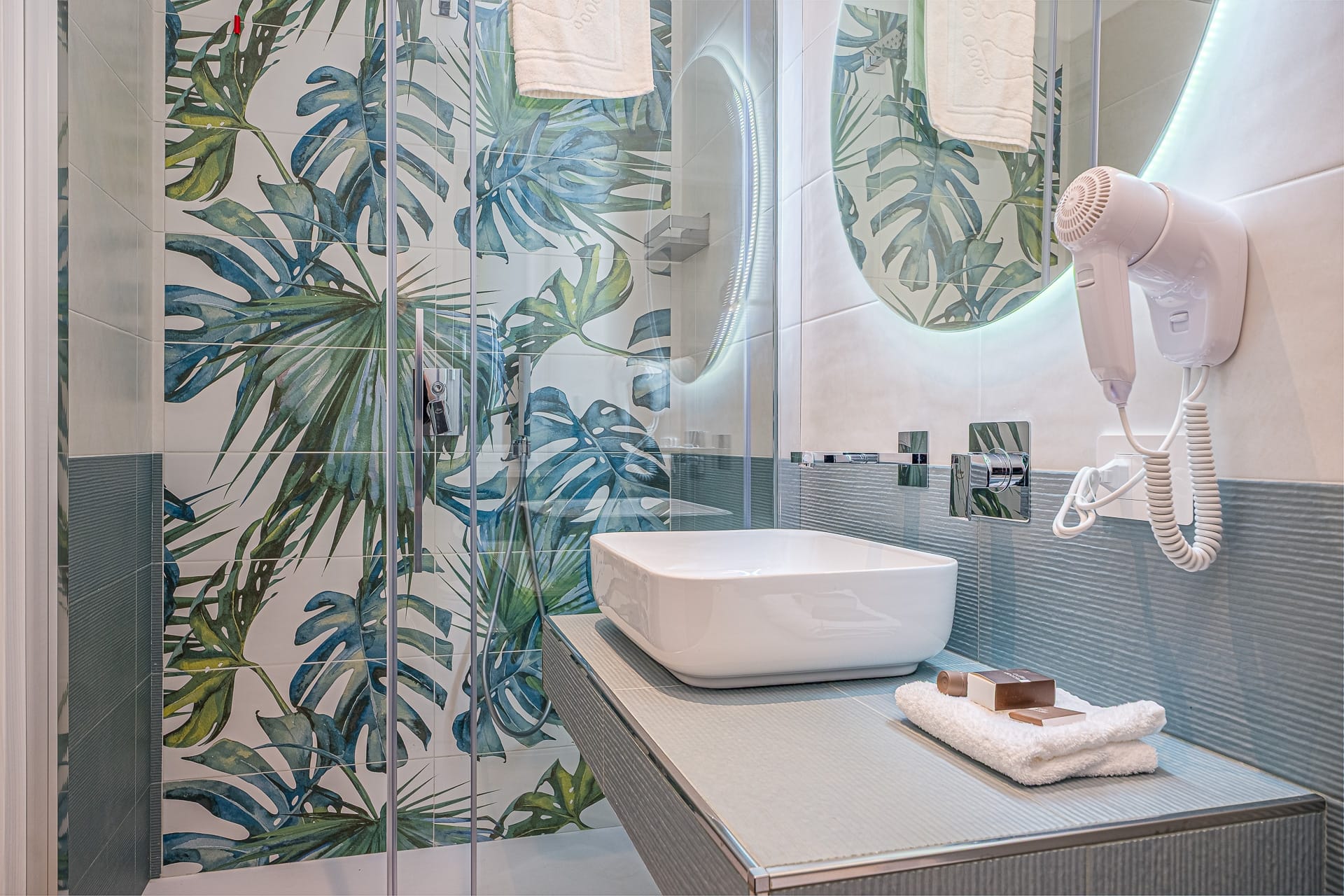 Il bagno privato, moderno e luminoso, è dotato di ampia doccia, bidet, asciugacapelli e un set di cortesia completo, perfetto per iniziare e concludere la giornata con comfort.