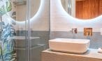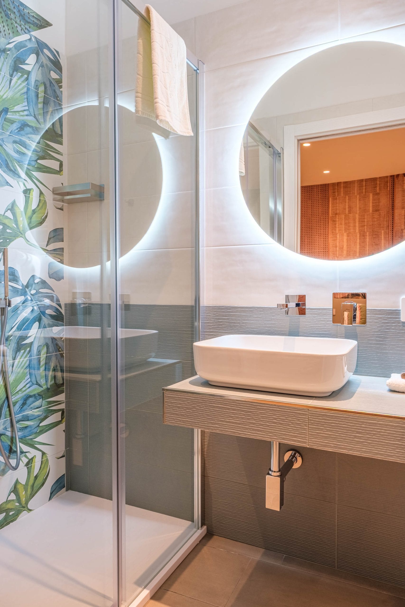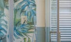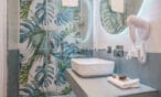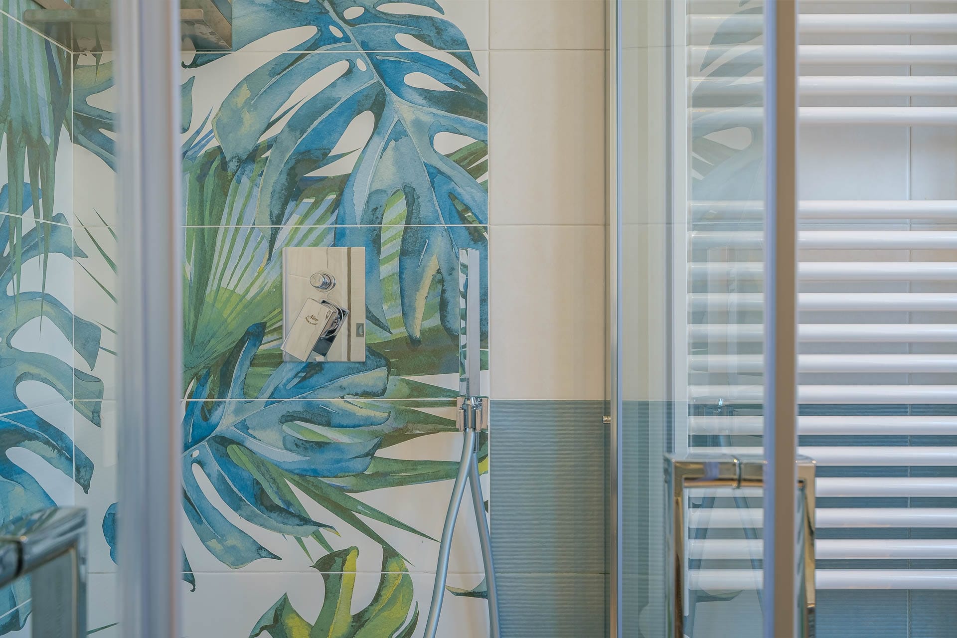 Il bagno, dallo stile tropicale con doccia walk-in e piastrelle a foglie verdi, è un piccolo gioiello di freschezza.