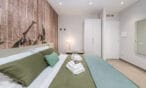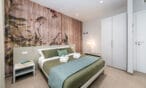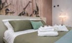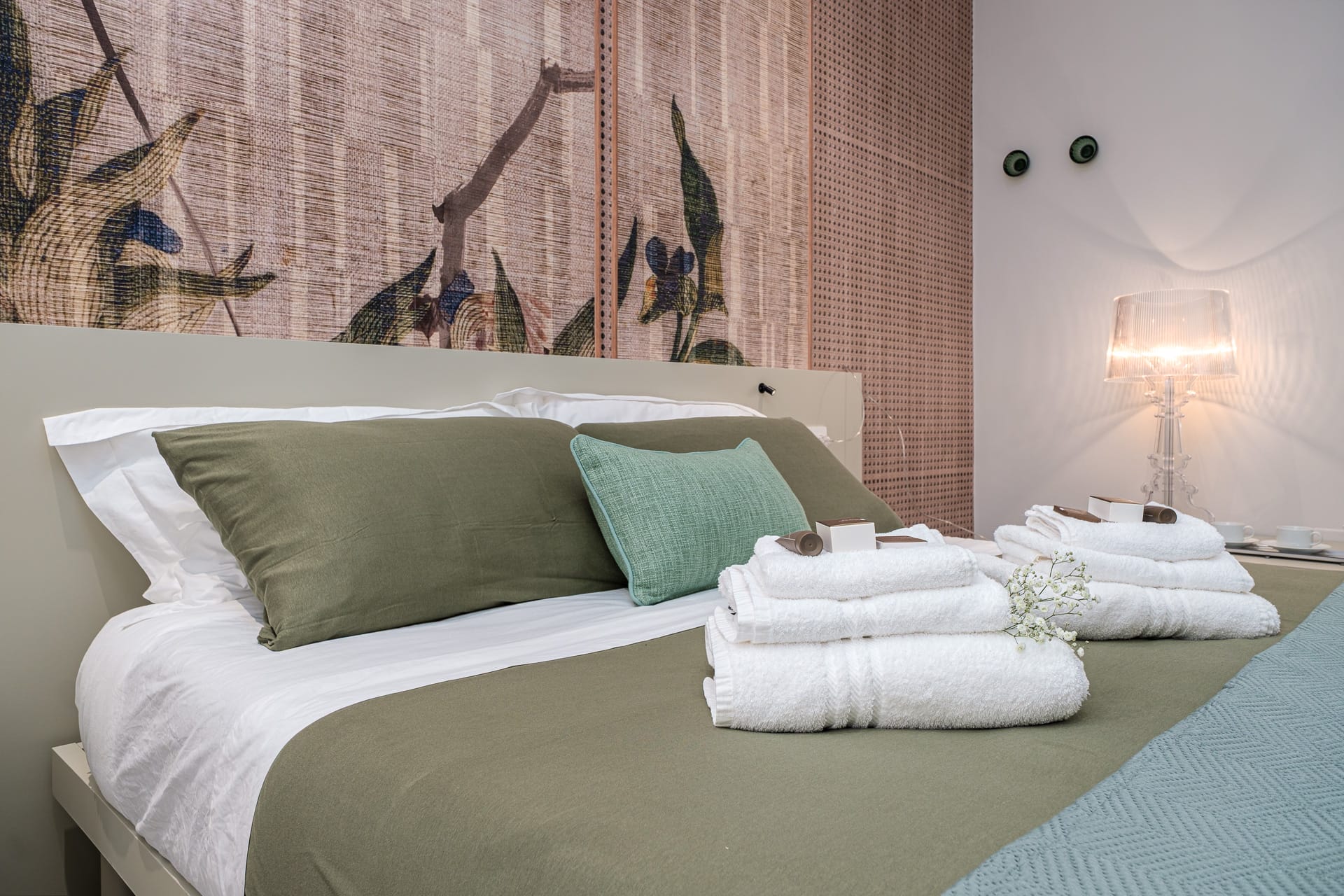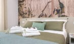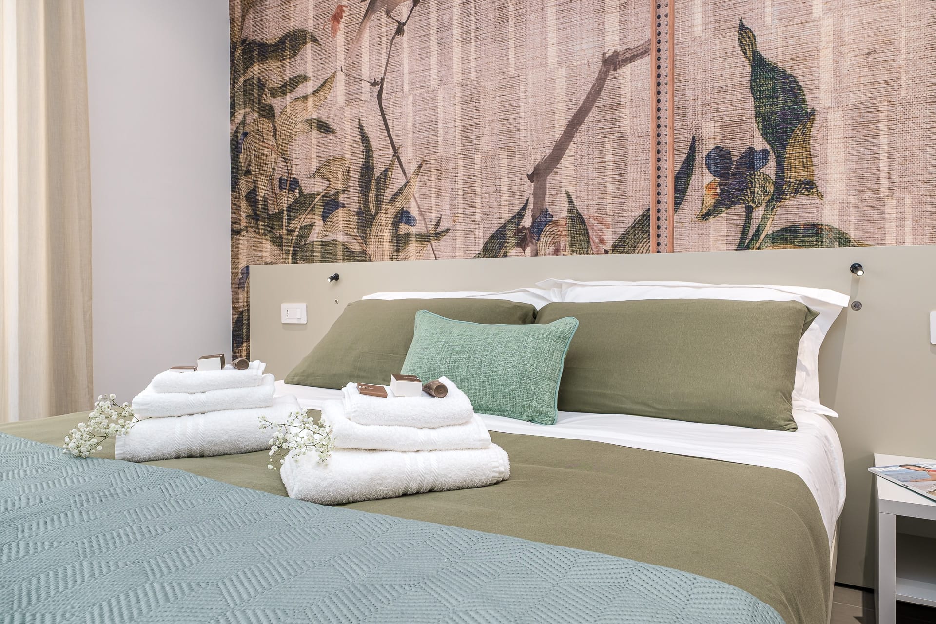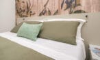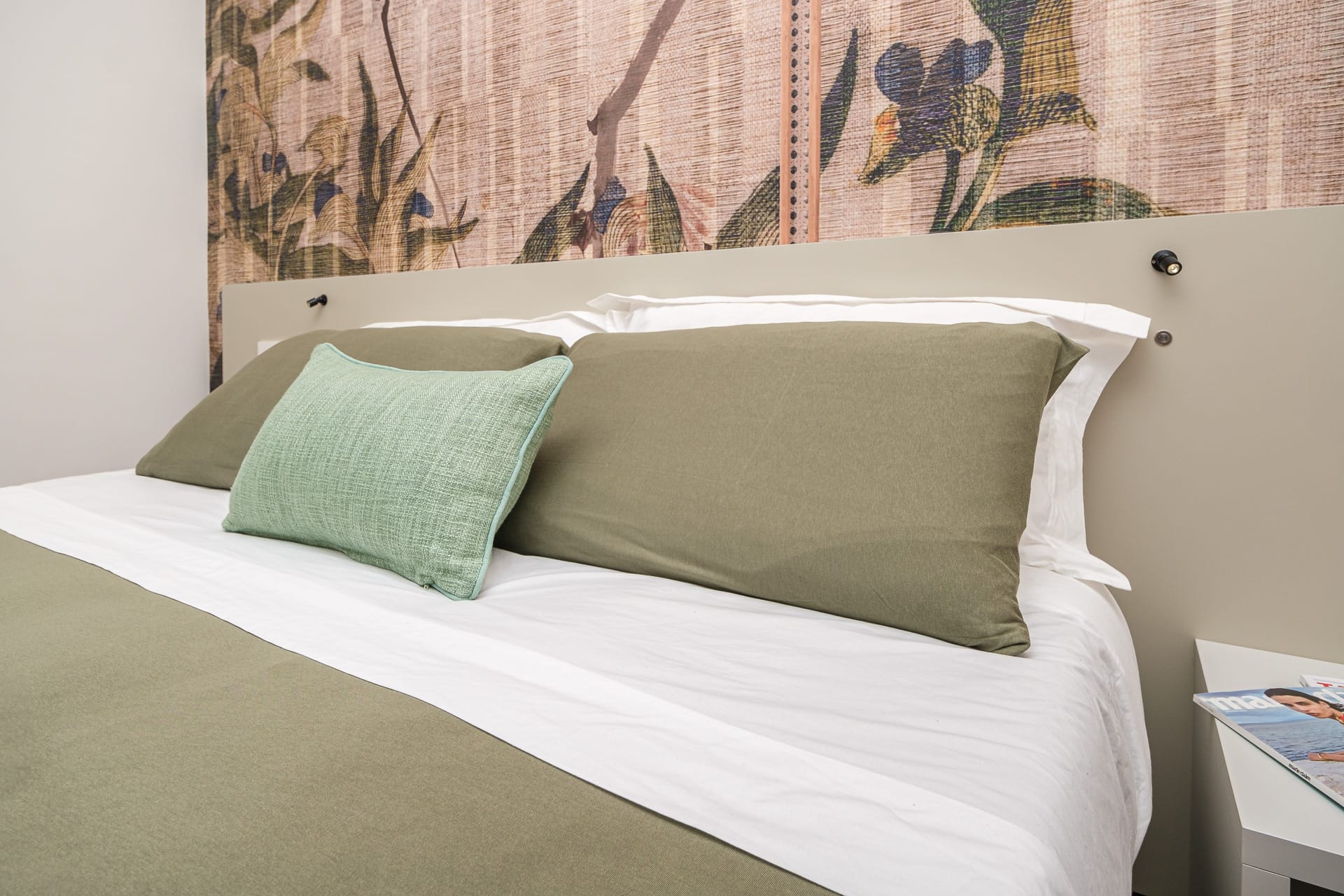 l copriletto verde salvia, i cuscini dai toni naturali e la grande carta da parati con motivi orientali creano un ambiente armonioso e moderno.