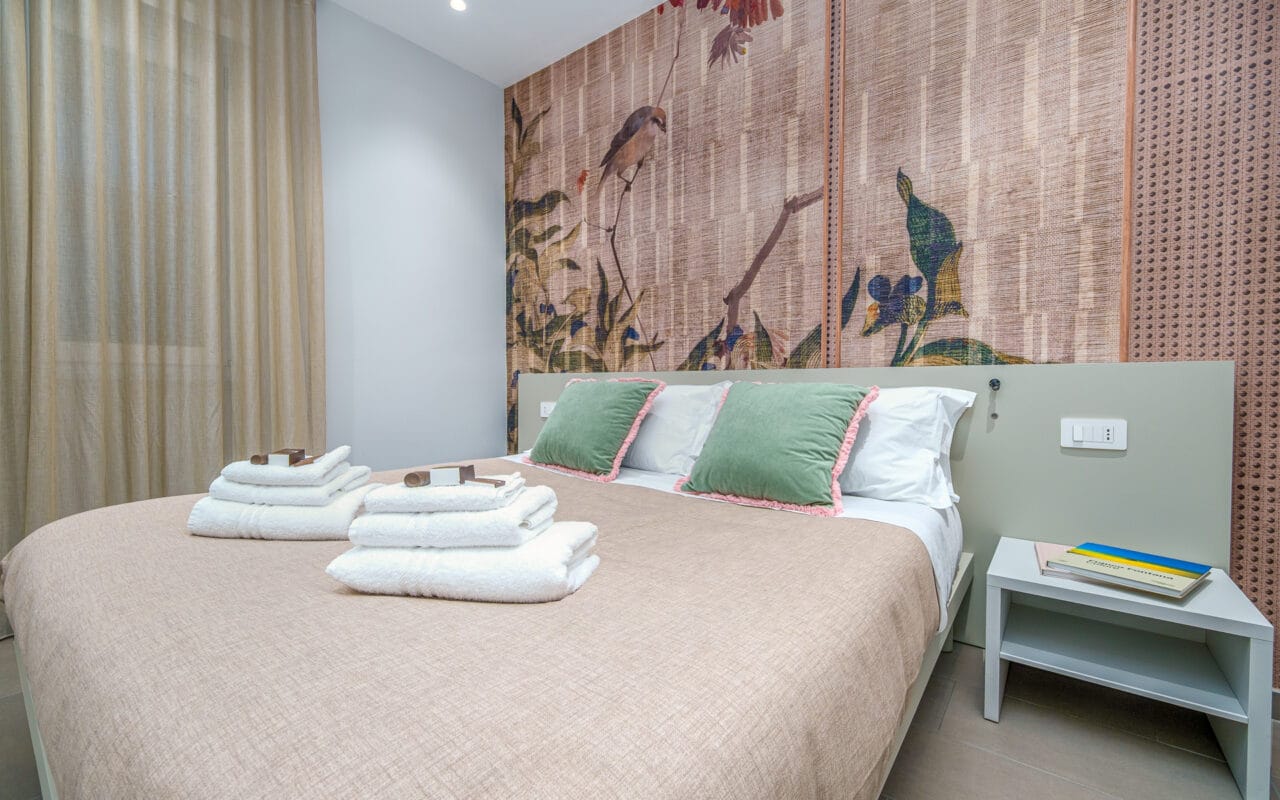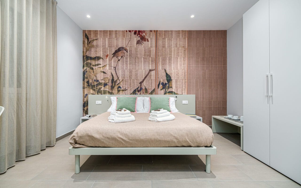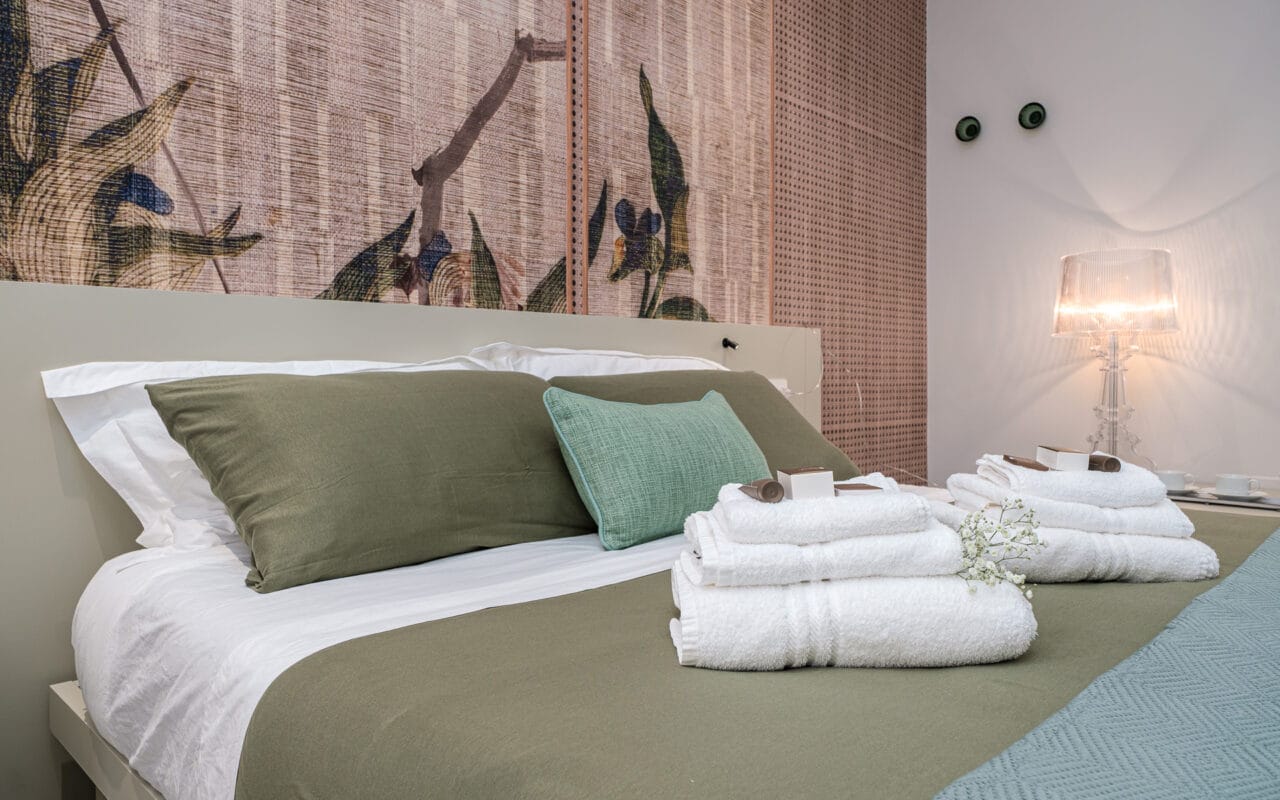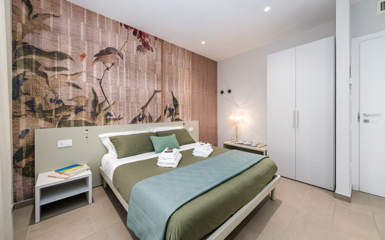 Una camera matrimoniale luminosa e accogliente, perfetta per chi cerca un’atmosfera rilassante. I l copriletto verde salvia, i cuscini dai toni naturali e la grande carta da parati con motivi orientali creano un ambiente armonioso e moderno.Il bagno, dallo stile tropicale con doccia walk-in e piastrelle a foglie verdi, è un piccolo gioiello di freschezza. […]