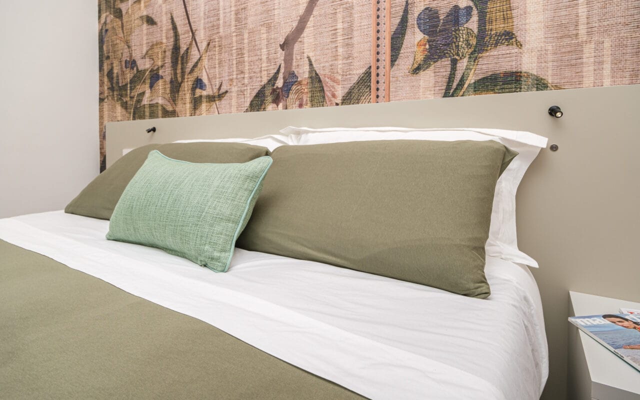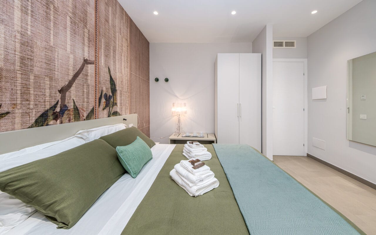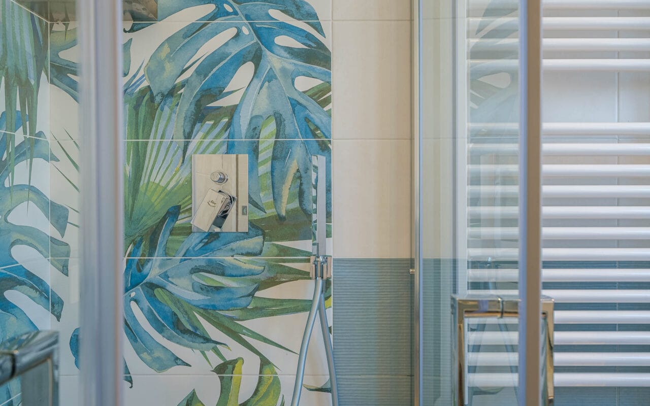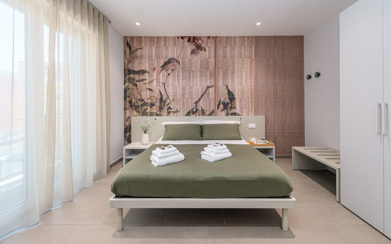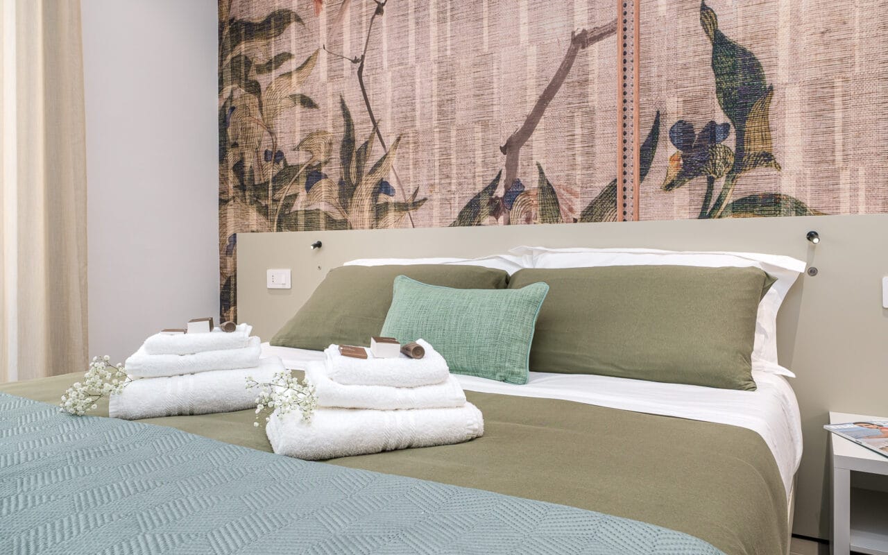 Una camera matrimoniale luminosa e accogliente, perfetta per chi cerca un’atmosfera rilassante. I l copriletto verde salvia, i cuscini dai toni naturali e la grande carta da parati con motivi orientali creano un ambiente armonioso e moderno.Il bagno, dallo stile tropicale con doccia walk-in e piastrelle a foglie verdi, è un piccolo gioiello di freschezza. […]